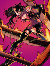 Later on stealing the contents of a safe belonging to the Falcone crime family, Selina returns home to find Kitrina Falcone, a teenaged escape artist and Carmine Falcone'due south long lost daughter, breaking into her room. She attacks and subdues Kitrina, who tells Selina that she had unknowingly stolen a map that details the location of the new Blackness Mask's hugger-mugger bunker. Realizing that she could utilise the map to capture Black Mask and claim the 50 million dollar compensation on his head, Selina leaves Kitrina jump in a locked room so that she can go along the map for herself. She subsequently calls Batman to her firm in social club to plough the would-be thief over to the police, but discovers that Kitrina had managed to free herself and steal back the map. This impresses Selina, who mentions that she had tied up the kid using an "inescapable" knot that Bruce had shown her years earlier. Following a massive battle with Black Mask and his henchmen (which ends with neither woman being able to claim the bounty), Selina agrees to take on Kitrina equally her new sidekick, Catgirl. Once Bruce Wayne returns from his time in the past, he establishes Batman Incorporated, a global team of Batmen. Selina accompanies him on a mission to interruption into Md Sivana's arsenal, and later on travels with him to Tokyo in order to recruit a Japanese representative for Batman Incorporated.
